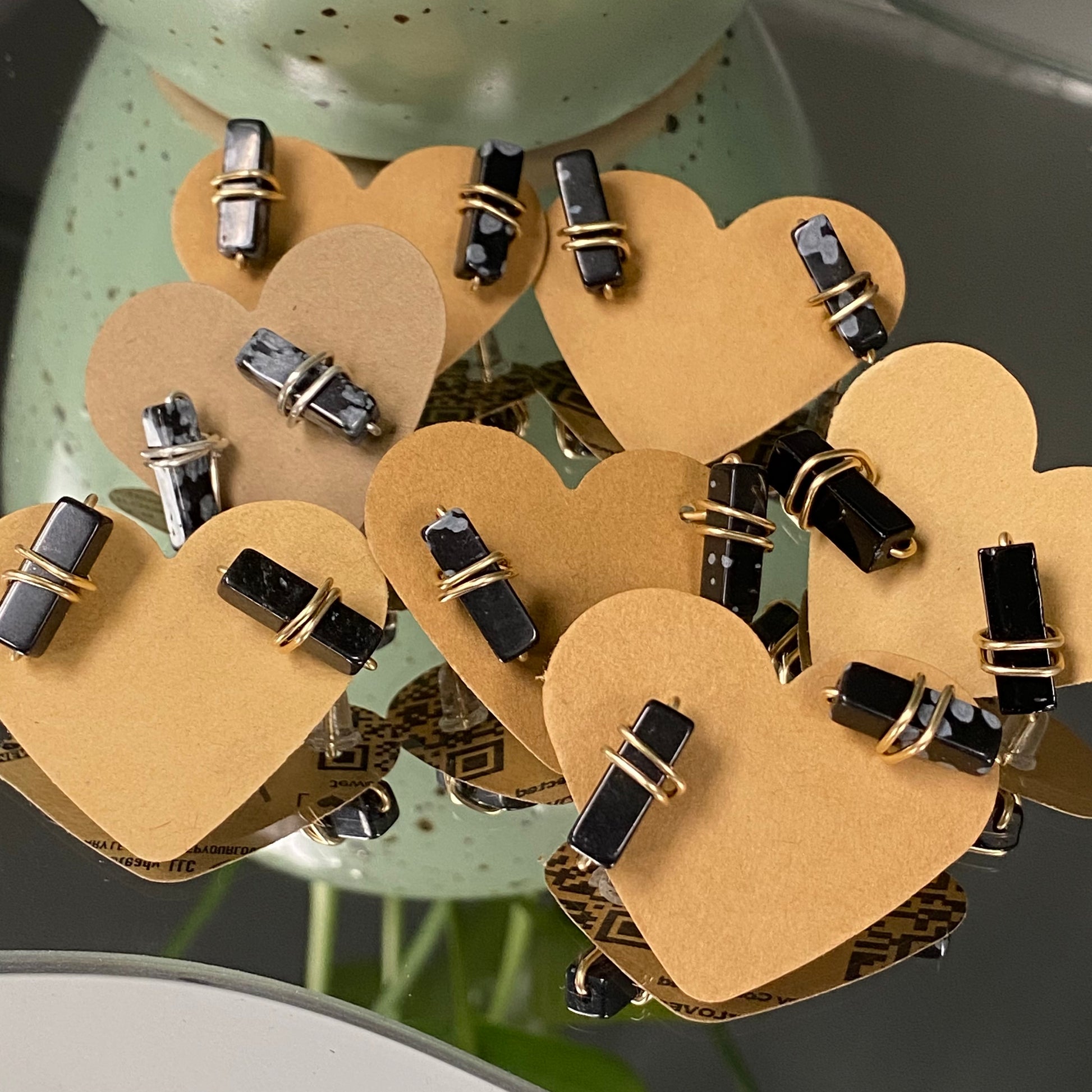 These Snowflake Obsidian Studs are hand-wrapped with a stylish touch. The semi-precious gemstone is known for its ability to bring balance and harmony to its wearers. Obsidian is believed to provide protection from negative energy, making these studs a perfect choice for those looking to anchor into their power.